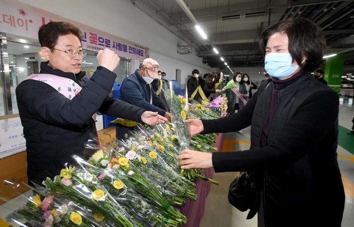 [½Ã»çÄÚ¸®¾ÆÀú³Î ±è¿¬ÇÐ ±âÀÚ] °æ»óºÏµµ´Â 13ÀÏ Ãâ±Ù½Ã°£ µµÃ» Çö°ü ¾Õ¿¡¼ ¹æ¹®°´°ú Á÷¿ø¿¡°Ô ²ÉÀ» ³ª´©¾î ÁÖ´Â ²É ¼ÒºñÃËÁø Çà»ç¸¦ °¡Á³´Ù.