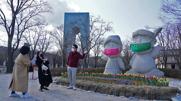 Á¤¹® ¾Õ¿¡ ¼ÀÖ´Â °æÁÖ¿¢½ºÆ÷ ¸¶½ºÄÚÆ® ‘ȶû’°ú ‘¿øÈ’´Â ´ëÇü ¸¶½ºÅ©¸¦ Âø¿ëÇØ ¸¶½ºÅ© Âø¿ë ¹× °³ÀÎÀ§»ý°ü¸®¿¡ ´ëÇÑ Á߿伺À» º¸¿©ÁÖ¸ç °ü±¤°´ »çÁøÃÔ¿µ Àå¼Ò·Îµµ È£ÀÀÀ» ¾ò°í ÀÖ´Ù.