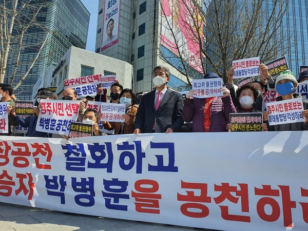 [½Ã»çÄÚ¸®¾ÆÀú³Î À̵¿¿ì ±âÀÚ] ¹Úº´ÈÆ ¿¹ºñÈĺ¸(¹Ì·¡ÅëÇÕ´ç °æÁÖ½Ã)¿Í ÁöÁöÀÚ 100¿©¸íÀº 27ÀÏ, ¹Ì·¡ÅëÇÕ´ç Ȳ±³¾È´ëÇ¥ ¼±°Å»ç¹«¼Ò¿Í ±¹È¸¿¡¼ ±âÀÚȸ°ßÀ» ÇÏ°í “°æÁֽùΠ¶æÀ¸·Î È®Á¤µÈ °øÃµÀ» °Á¦·Î µÚ¾þÀº ¹Ì·¡ÅëÇÕ´ç ÃÖ°íÀ§¿Í °ø°üÀ§´Â Áï½Ã ´çÇå, ´ç±Ô¿¡ ÇÕ´çÇÑ °á°ú·Î ½ÃÁ¤Á¶Ä¡¸¦ Ç϶ó”°í Ã˱¸Çß´Ù°í ¹àÇû´Ù.