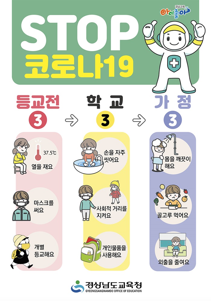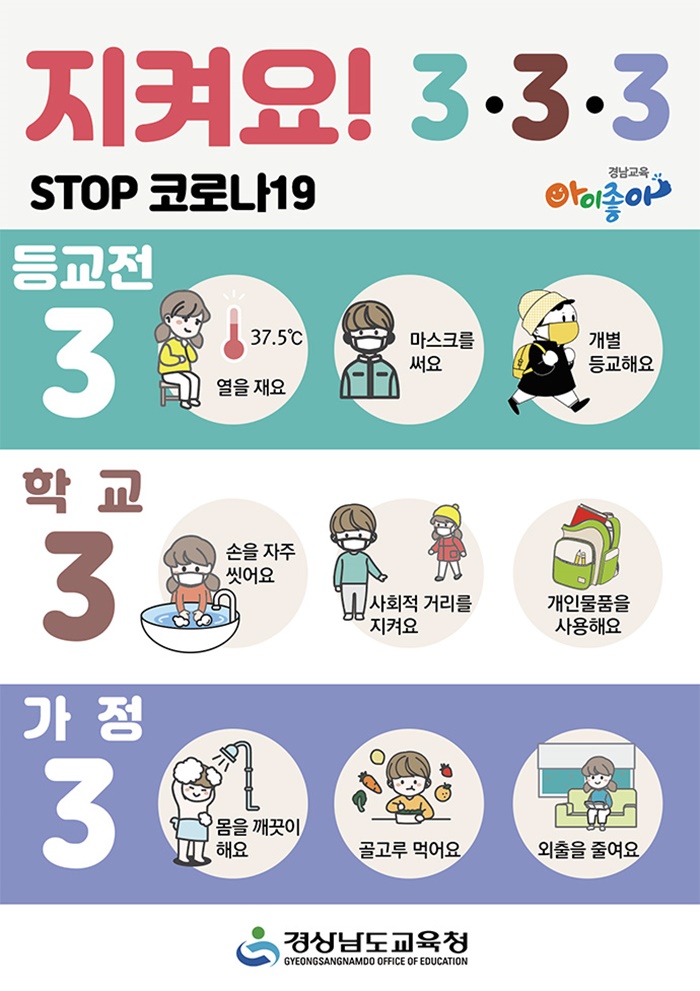 [½Ã»çÄÚ¸®¾ÆÀú³Î=±èÈñ¿µ ±âÀÚ] °æ³²±³À°Ã»Àº Äڷγª19(COVID-19) ¿¹¹æ¿¡ ´Éµ¿ÀûÀ¸·Î ´ëÀÀÇϰíÀÚ ‘STOP Äڷγª19 ÁöÄÑ¿ä 3·3·3’ ÀڷḦ Á¦ÀÛ, Àü ÃʵîÇб³¿¡ ¹èºÎÇÑ´Ù°í ¹àÇû´Ù.