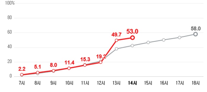 15ÀÏ ¿¸° 21´ë ÃѼ± ÅõÇ¥À²ÀÌ ¿ÀÈÄ 2½Ã ÇöÀç 52.9%¸¦ ±â·ÏÇØ Áö³ 20´ë ÃѼ± ÃÑ ÅõÇ¥À²¿¡ ´Ù°¡°¬´Ù.