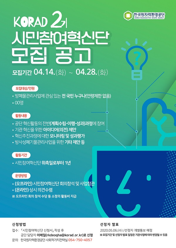 ¹æ»ç¼ºÆó±â¹°°ü¸®»ç¾÷¿¡ °ü½ÉÀÖ´Â ±¹¹ÎÀ̶ó¸é ´©±¸³ª Áö¿øÇÒ ¼ö ÀÖÀ¸¸ç Áö¿ø¹æ¹ýÀº Çѱ¹¿øÀÚ·Âȯ°æ°ø´Ü ȨÆäÀÌÁö(www.korad.or.kr)³ª ±¹¹Î»ý°¢ÇÔ(idea.epeople.go.kr)¿¡ °Ô½ÃµÈ ¸ðÁý°ø°í¸¦ Âü°íÇÏ¿© °ø´Ü ´ã´çÀÚ À̸ÞÀÏ(rkdeoqha@korad.or.kr)·Î ½ÅûÇÏ¸é µÈ´Ù.