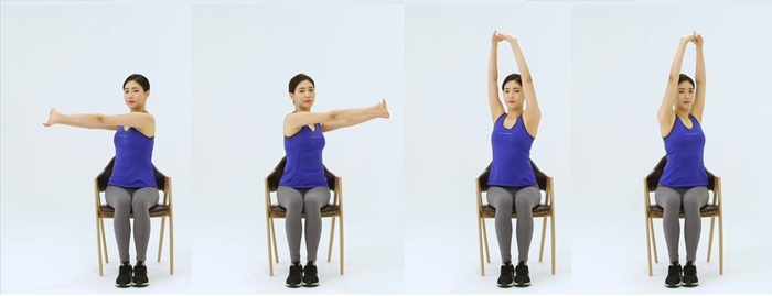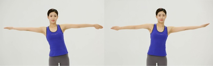 ÀÌÈÄ ¸öÅëÀ» ¿ÞÂÊÀ¸·Î ±â¿ïÀÌ¸é¼ ¿Þ¼ÕÀº À§, ¿À¸¥¼ÕÀ» ¾Æ·¡¸¦ ÇâÇϵµ·Ï ¹æÇâÀ» ¹Ù²ãÁØ´Ù. ÀÌ ¶§ ¾ç ¾î±ú¿Í ÆÈÀÌ ÀÏÁ÷¼±ÀÌ µÇµµ·Ï À¯ÁöÇÑ´Ù. ¿©±â±îÁöÀÇ µ¿ÀÛÀ» 1¼¼Æ®·Î ÃÑ 3ȸ ¹Ýº¹ÇÑ´Ù.