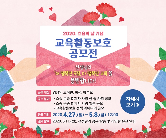 [½Ã»çÄÚ¸®¾ÆÀú³Î=±èÈñ¿µ ±âÀÚ] °æ³²±³À°Ã»Àº 2020³â ½º½ÂÀÇ ³¯À» ¾ÕµÎ°í ‘½º½ÂÁ¸°æ, Á¦ÀÚ»ç¶û’ÀÇ ÇູÇÑ ±³À°È°µ¿ dzÅä Á¶¼ºÀ» À§ÇØ '2020. ½º½ÂÀÇ ³¯ ±â³ä ±³À°È°µ¿º¸È£ Á¤Ã¥ °ø¸ðÀü'À» °³ÃÖÇÑ´Ù.