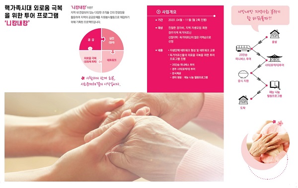 °ø¸ð»ç¾÷À¸·Î ¼±Á¤µÈ ‘Áö¿ª»çȸ ¾È³ç ³×Æ®¿öÅ©¸Á ±¸Ãà ÇÁ·ÎÁ§Æ® ¡¸´ÏIJ³»Ä²¡¹(ÀÌÇÏ ´ÏIJ³»Ä²)’Àº ‘¿Ü·Î¿ò’ ±Øº¹À» ¸ñÇ¥·Î »ï¾Æ Áö¿ª ÀÚ»ý´Üüµé°ú ¾î¸£½ÅµéÀ» 1:1·Î ¸ÅĪ ÇÔÀ¸·Î½á Áö¿ª »çȸÀÇ ³×Æ®¿öÅ©¸¦ Çü¼ºÇØ ÀÚ¿øºÀ»ç Ȱ¼ºÈ ¹× ±àÁ¤ÀûÀÎ Áö¿ª»çȸ Çü¼º¿¡ ±â¿©ÇϰíÀÚ ±âȹµÆ´Ù.