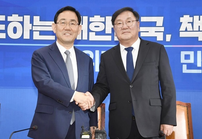 | ´õºÒ¾î¹ÎÁÖ´ç ±èų⠿ø³»´ëÇ¥(¿À¸¥ÂÊ)¿Í ¹Ì·¡ÅëÇÕ´ç ÁÖÈ£¿µ ¿ø³»´ëÇ¥°¡ 14ÀÏ ±¹È¸ ¹ÎÁÖ´ç ¿ø³»´ëÇ¥½Ç¿¡¼ ¸¸³ª ¾Ç¼öÇϰí ÀÖ´Ù. |