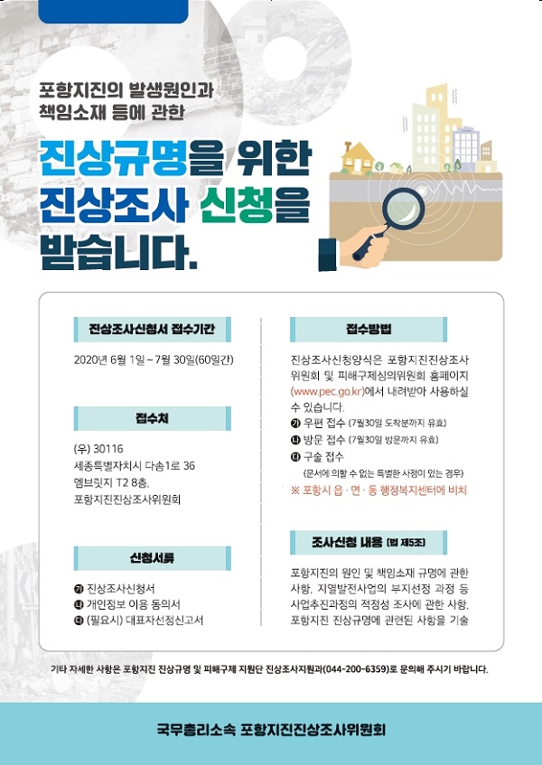 ÀÌÇÐÀº À§¿øÀåÀº “À̹ø Áø»óÁ¶»ç½ÅûÀ» ÅëÇØ Æ÷Ç×ÁöÁøÀÇ ±¸Ã¼ÀûÀÎ ¹ß»ý¿øÀΰú Ã¥ÀÓ¼ÒÀçÀÇ Áø»óÀÌ ¹àÇôÁú ¼ö ÀÖµµ·Ï ¸¹Àº ºÐµéÀÇ Àû±ØÀûÀÎ °ü½É°ú Âü¿©¸¦ ºÎʵ台´Ù”¸é¼ “Áø»óÁ¶»ç½Åû¼ Á¢¼ö ±âÇÑÀÌ 2020³â 7¿ù 30ÀϱîÁö·Î Á¤ÇØÁ® ÀÖ´Â ¸¸Å, ½ÃÀÏÀ» ³õÃÄ ½ÅûÇÏÁö ¸ø ÇÏ´Â ÀÏÀÌ ¾øµµ·Ï ½Ã¹Îµé°ú Àû±ØÀûÀ¸·Î ¼ÒÅëÇϰڴٔ°í ¸»Çß´Ù.