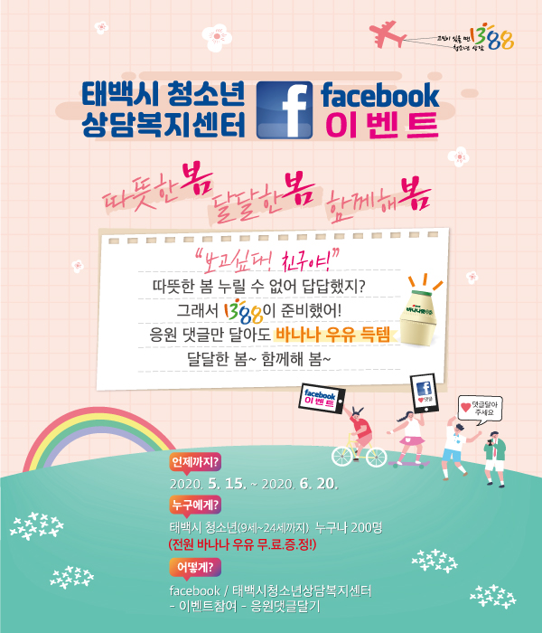 Áö³ 15ÀϺÎÅÍ 6¿ù 20ÀϱîÁö ÁøÇàµÇ´Â ‘µû¶æÇÑ º½, ´Þ´ÞÇÑ º½, ÇÔ²²ÇØ º½’ À̺¥Æ®´Â ÆäÀ̽ººÏ(https://www.facebook.com/Źé½Ãû¼Ò³â»ó´ãº¹Áö¼¾ÅÍ-100276078344649/)¿¡¼ û¼Ò³âÀ» À§ÇÑ ÀÀ¿ø ´ñ±ÛÀ» ³²±â°Å³ª Ä£±¸Ãßõ ¹× °øÀ¯¸¦ ÇÏ¸é ¹Ù³ª³ª¿ìÀ¯ ¸ð¹ÙÀÏÄíÆùÀ» ÁõÁ¤ÇÑ´Ù.