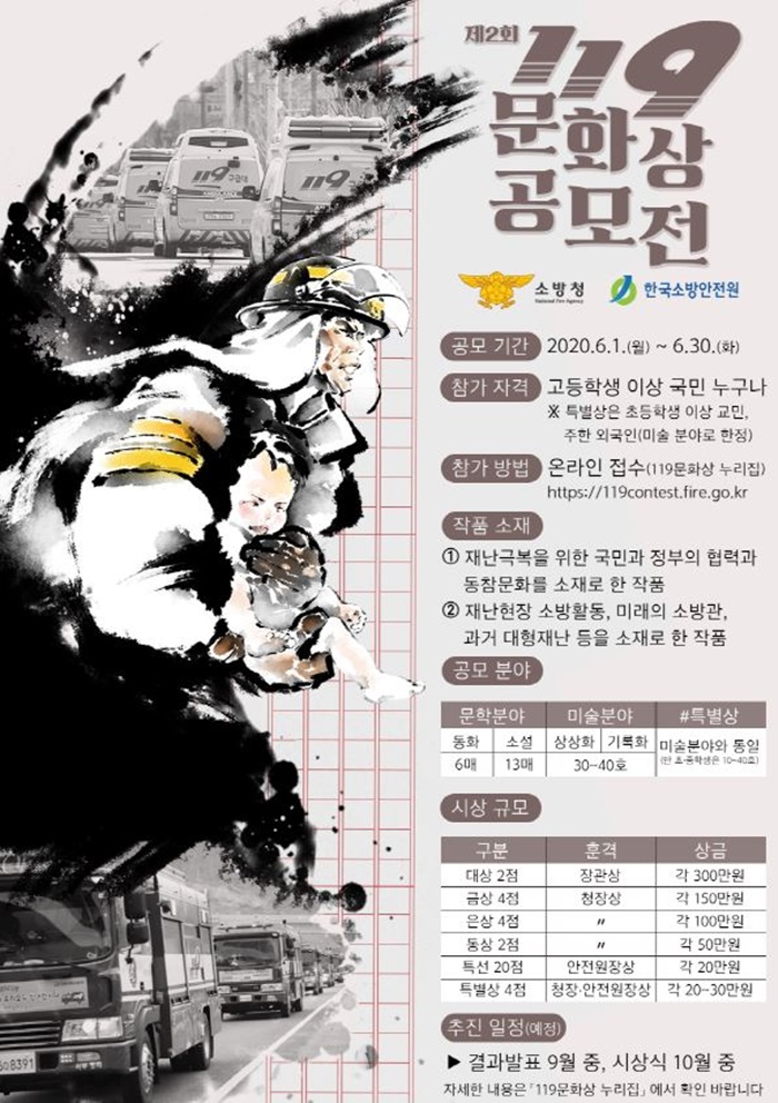 ‘Á¦2ȸ 119¹®È»ó’Àº ¼Ò¹æÀ» ÁÖÁ¦·Î ÇÑ Ã¢ÀÛ ¿¹¼úÀÛǰ(¹®ÇФý¹Ì¼ú) °ø¸ð¸¦ ÅëÇØ ±¹¹Î¾ÈÀü¹®È¸¦ È®»êÇϰí Âü¿©ÀÚ¿¡°Ô ¼Ò¹æÀÇ °¡Ä¡¿Í ¿ªÇÒÀ» »ý°¢ÇÒ ¼ö ÀÖ´Â ±âȸ¸¦ ÁÖ°íÀÚ ¸¶·ÃµÆ´Ù.