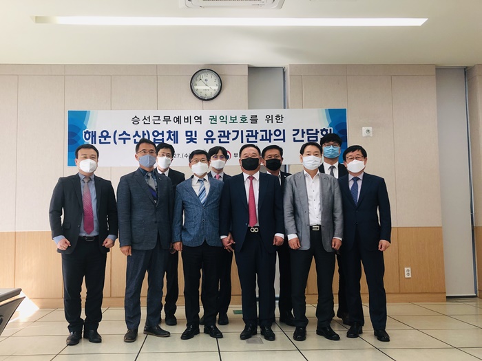 [½Ã»çÄÚ¸®¾ÆÀú³Î=ÀÌȯ¼ö ±âÀÚ] ºÎ»êÁö¹æº´¹«Ã»(ûÀå ±èÁ¾Ã¶)Àº 27ÀÏ ºÎ»ê Áß±¸¿¡ À§Ä¡ÇÑ ¼±¿ø¼¾ÅÍ¿¡¼ Çѱ¹¼±¹Ú°ü¸®»ê¾÷Çùȸ, HMM ¿À¼Ç¼ºñ½º(ÁÖ) µî ÇØ¿î¾÷ü °ü°èÀÚµé°ú ½Â¼±±Ù¹«¿¹ºñ¿ª ±ÇÀͺ¸È£¸¦ À§ÇÑ °£´ãȸ¸¦ °¡Á³´Ù°í ¹àÇû´Ù.