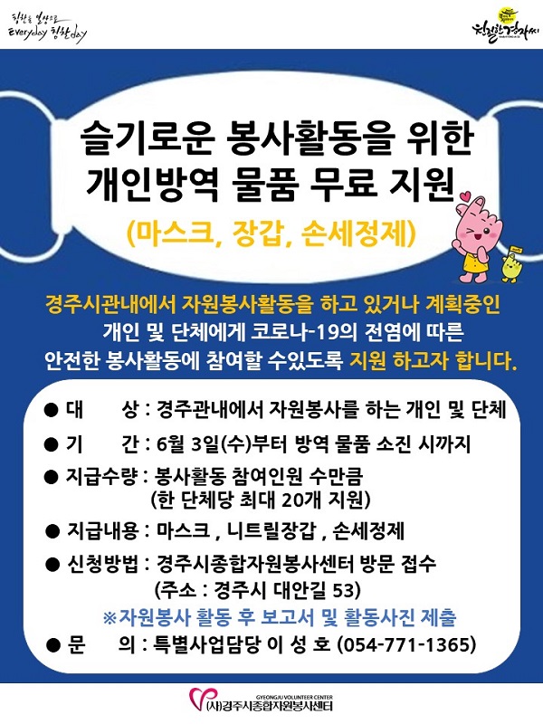 Áö¿ø´ë»óÀº °æÁֽà °ü³»¿¡¼ Ȱµ¿ÇÏ´Â ÀÚ¿øºÀ»çÀÚ ¹× ´ÜüÀ̸ç, ÀÚ¿øºÀ»çȰµ¿¿¡ Âü¿©ÇÏ´Â °æÁֽùÎÀ» À§ÇØ ¸¶½ºÅ©, Àå°©, ¼Õ¼¼Á¤Á¦¸¦ ´Üü ´ç ÃÖ´ë 20°³±îÁö Áö¿øÇϸç, ÀÚ¿øºÀ»ç¼¾ÅÍ¿¡ ¹æ¹®ÇØ ½Åû¼ ÀÛ¼º ÈÄ Áö¿ø¹ÞÀ» ¼ö ÀÖ´Ù.