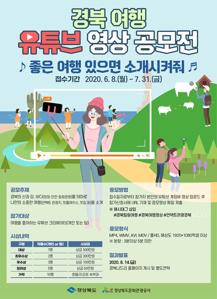 ‘ÁÁÀº¿©Çà ÀÖÀ¸¸é ¼Ò°³½ÃÄÑÁà~¢Ü¢Ý’¶ó´Â ºÎÁ¦·Î ÁøÇàµÇ´Â À̹ø °ø¸ðÀüÀº °æºÏÀÇ »ê°ú °, ¹Ù´Ù µî ûÁ¤․¾ÈÀü․Èú¸µÀ» Å׸¶·Î ³ª¸¸ÀÇ ¼ÒÁßÇÑ ¿©ÇàÁö¸¦ Á÷Á¢ ¼Ò°³ÇÏ´Â ¿µ»óÀ» Á¦ÀÛÇØ Á¦ÃâÇÏ¸é µÈ´Ù.