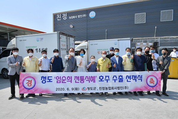 [½Ã»çÄÚ¸®¾ÆÀú³Î=À̵¿¿ì ±âÀÚ] ûµµ±º(±º¼ö À̽ÂÀ²)°ú Ä£Á¤³ó¾÷ȸ»ç¹ýÀÎ(ÁÖ)(´ëÇ¥ Á¤Èñ¼ø)´Â ÄÚÆ®¶ó¸¦ ÅëÇØ ûµµ¿¡¼ »ý»êµÈ ÀüÅë½ÄÇýÀÎ ‘ÀÓ¼øÈñ ÀüÅë½ÄÇý’ Á¦Ç°À» È£ÁÖ¿¡ ¼öÃâÇϱâ À§ÇØ 9ÀÏ »ý»ê°øÀå ¾Õ¿¡¼ ¼±Àû½ÄÀ» °¡Á³´Ù.