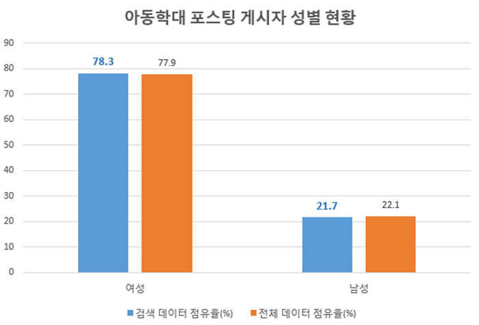ÇÑÆí ¾Æµ¿Çд븦 Ű¿öµå·Î °Ô½Ã±ÛÀ» ¿Ã¸° »ç¶÷µéÀÇ ¼ºº°À» ºÐ¼®ÇÑ °á°ú ¿©¼ºÀÌ 78.3%·Î ³ªÅ¸³ª °°Àº ±â°£ ¿©¼ºÀÇ ´ëÇѹα¹ Àüü ¿Â¶óÀÎ Á¤º¸·® Á¡À¯À² 77.9%º¸´Ù ¼ÒÆø ³ô´Ù.