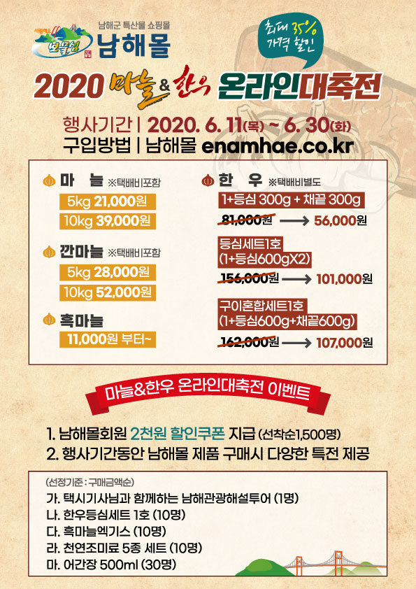´ëÃàÀü ±â°£ ³²ÇرºÀº ³²Çظô(enamhae.co.kr) ȸ¿ø 1,500¸í¿¡°Ô ¼±Âø¼øÀ¸·Î 2õ¿ø »ó´çÀÇ ÇÒÀÎÄíÆùÀ» Áö±ÞÇÑ´Ù. ÇÒÀÎÄíÆùÀ» Áö±Þ¹ÞÀº ȸ¿øµéÀº ±ñ¸¶´Ã, Èæ¸¶´ÃÀ» Æ÷ÇÔÇÑ ¸¶´Ã°ú Çѿ츦 ÇÒÀÎµÈ °¡°ÝÀ¸·Î ±¸¸ÅÇÒ ¼ö ÀÖ´Ù. ¶Ç ÇÒÀÎÄíÆù°ú´Â º°µµ·Î ÇÑ¿ì´Â ÃÖ´ë 35%±îÁö ÇÒÀÎµÈ °¡°ÝÀ¸·Î ±¸¸ÅÇÒ ¼ö ÀÖ´Ù.