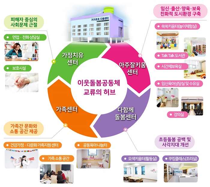 ‘°¡°¡È£È£ ´Ù¿Ã¼¾ÅÍ(°¡Á¤ÇູÁö¿ø¼¾ÅÍ)´Â °ÇÃà¸éÀû 796§³(¿¬¸éÀû 3,500§³), ÁöÇÏ 1Ãþ, Áö»ó 4Ãþ °Ç¹°·Î ¡âÀӽŷÃâ»ê·¾çÀ°·º¸À° Ä£ÈÀû µµ½Ãȯ°æ ±¸ÃàÀ» À§ÇÑ ¾ÆÁÖ ÀßŰ¿ò¼¾ÅÍ ¡â Ãʵº½ °ø¹é ¹× »ç°¢Áö´ë °³¼±À» À§ÇÑ ´ÙÇÔ²² µ¹º½¼¾ÅÍ ¡â °¡Á·°£ ¹®È¿Í ¼ÒÅë°ø°£ÀÎ °¡Á·¼¾ÅÍ ¡â ÇູÇÑ ºÎºÎ°ü°è Çü¼ºÀ» À§ÇÑ °¡Á¤ Ä¡À¯¼¾Å͸¦ ÇѰ÷¿¡ ¼³Ä¡ÇØ ¾ÆÀ̳º°í Ű¿ì±â ÁÁÀº ȯ°æÀ» Á¶¼ºÇÑ´Ù.