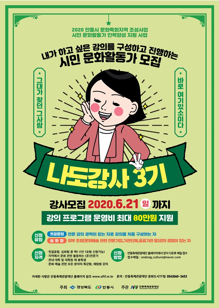 [½Ã»çÄÚ¸®¾ÆÀú³Î=±è¿¬ÇÐ ±âÀÚ] (Àç)¾Èµ¿ÃàÁ¦°ü±¤Àç´ÜÀº ¹®ÈƯÈÁö¿ª Á¶¼º»ç¾÷ÀÇ ÀÏȯÀ¸·Î ¿À´Â 6¿ù 21ÀϱîÁö ¾Èµ¿ ½Ã¹ÎµéÀ» ´ë»óÀ¸·Î ÀÚ½ÅÀÇ Àç´ÉÀ» ÆîÄ¥ ¼ö ÀÖ´Â °ÀÇ ÇÁ·Î±×·¥À» ±âȹÇϰí ÁøÇàÇÏ´Â ‘³ªµµ °»ç’3±â ½Ã¹Î °»ç¸¦ ¸ðÁýÇÑ´Ù.