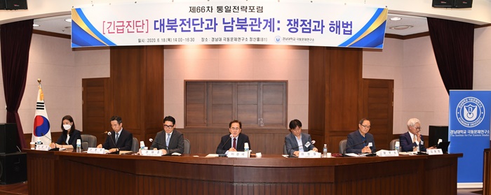 [½Ã»çÄÚ¸®¾ÆÀú³Î=ÀÌȯ¼ö ±âÀÚ] °æ³²´ë ±Øµ¿¹®Á¦¿¬±¸¼Ò(¼ÒÀå À̰ü¼¼)´Â 18ÀÏ ¿ÀÈÄ 2½ÃºÎÅÍ ¼¿ï ±Øµ¿¹®Á¦¿¬±¸¼Ò Á¤»êȦ¿¡¼ [±ä±ÞÁø´Ü] ‘´ëºÏÀü´Ü°ú ³²ºÏ°ü°è: ÀïÁ¡°ú ÇØ¹ý’À» ÁÖÁ¦·Î Á¦66Â÷ ÅëÀÏÀü·«Æ÷·³À» °³ÃÖÇß´Ù.