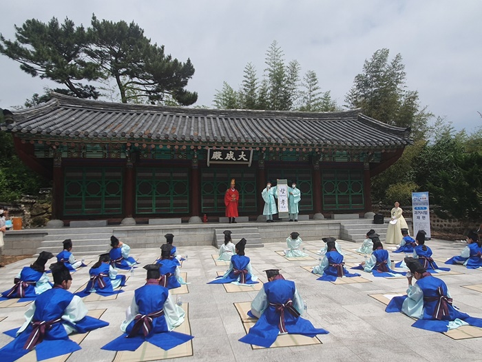 ÀÌ¾î ¸¶»êÇâ±³ ´ë¼ºÀü¿¡¼ ¿¸° °ú°Å½ÃÇè ÀçÇöÇà»ç¿¡¼´Â ¸¶»êÇâ±³ °ü°èÀÚ(Àü±³, ÀåÀÇ)°¡ ¿Õ°ú ½Ã°ü(ãËί) º¹ÀåÀ» Çϰí, À¯»ýº¹ÀåÀ» Âø¿ëÇÑ 30¿©¸í ÇлýµéÀÌ ‘Ù½(¾î¸Ó´Ï)¿Í üø(È¿)’ ½ÃÁ¦ ¹ßÇ¥¸¦ ½ÃÀÛÀ¸·Î °ú°Å ½ÃÇèÀ» ÀçÇöÇß´Ù.