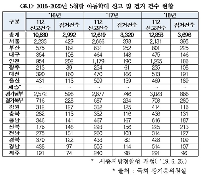 ±¹È¸ ¹Ì·¡ÅëÇÕ´ç °±âÀ± ÀÇ¿ø(â¿ø½Ã ¼º»ê±¸)ÀÌ °æÂûûÀÇ ÀڷḦ Á¶»çÇØ ºÐ¼®ÇÑ °á°ú, ¾Æµ¿Çдë ÇøÀÇ·Î °Ë°ÅµÈ °Ç¼ö´Â 2016³â 2,992°Ç, 2017³â 3,320°Ç, 2018³â 3,696°Ç, 2019³â 4,541°Ç, ¿ÃÇØ(5¿ù¸» ±âÁØ) 1,656°Ç µî °¡ÆÄ¸¥ Áõ°¡¼¼¸¦ º¸À̸ç ÃÖ±Ù 4³â 5°³¿ù°£ 1¸¸ 6,205°ÇÀ¸·Î Áý°èµÆ´Ù.