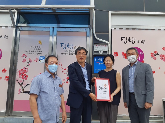 [½Ã»çÄÚ¸®¾ÆÀú³Î=±è¿¬ÇÐ ±âÀÚ] ¿µ¾ç±º ¼®º¸¸éÁö¿ª»çȸº¸ÀåÇùÀÇü(°øµ¿À§¿øÀå °»ó¼ö, Àå¼ö»ó)´Â 26ÀÏ ÀÌ¿ôÀ» À§ÇØ ³ª´®¹®È¿¡ µ¿ÂüÇÏ´Â »ç¾÷Àå 1°³¼Ò¸¦ ¹æ¹®, 'ÂøÇѰ¡°Ô' ÇöÆÇÀ» Àü´ÞÇß´Ù.