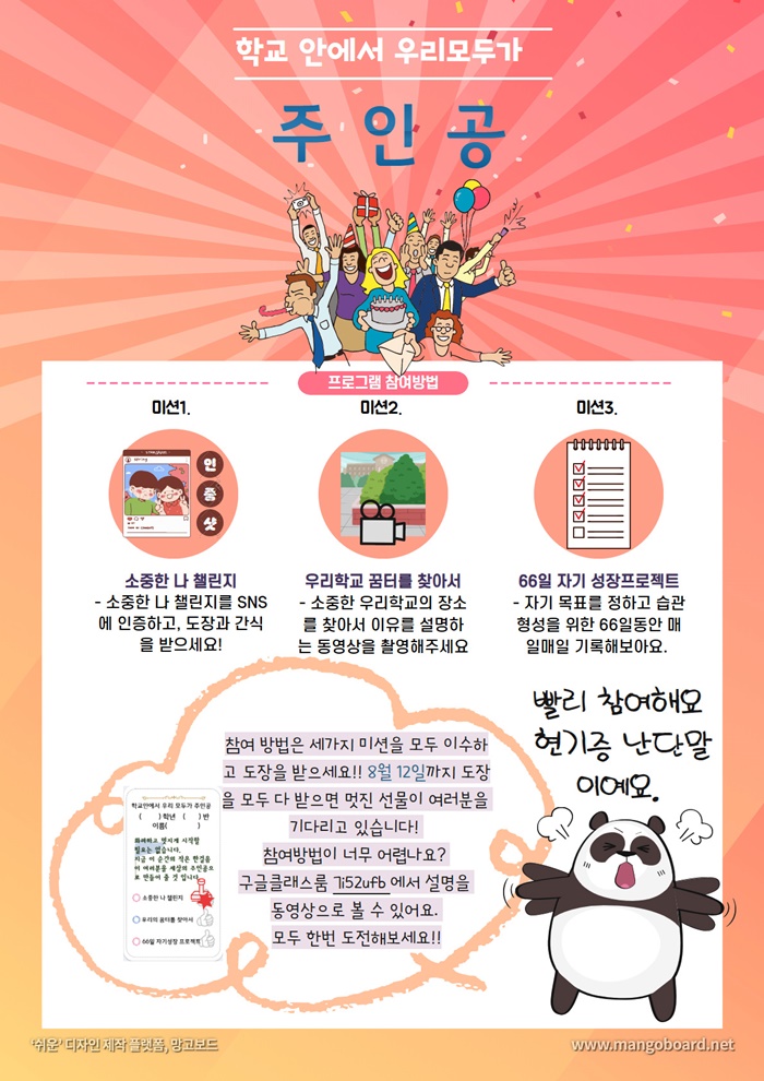 °úÁ¦1 ‘¼ÒÁßÇÑ ³ª’ 縰Áö »çÁøÀÎÁõ°ú °úÁ¦2 ‘¿ì¸® Çб³ ²Þ Å͸¦ ã¾Æ¼’ Çб³ °ø°£ ÃÔ¿µ ÀÎÁõÀ» ÅëÇØ ÀÚÁ¸°¨À» Çâ»óÇϰí, °úÁ¦3 ‘66ÀÏ Àڱ⠼ºÀå ÇÁ·ÎÁ§Æ®’´Â ÀÚ½ÅÀÌ Á¤ÇÑ ¸ñÇ¥¸¦ ½º½º·Î ´Þ¼ºÇÒ ¼ö ÀÖµµ·Ï °èȹµÆ´Ù. °úÁ¦4 ‘¸ðµÎ°¡ ÁÖÀΰø’Àº Äڷγª19 »óȲ¿¡¼ °úÁ¦ 1, 2, 3À» ¼öÇàÇÑ ÇлýȰµ¿ °á°ú¹° Àü½Ã¿Í µ¿¿µ»ó ½ÃûÀ» ÅëÇØ Çб³ ¾È¿¡¼ ¼ÒÁßÇÑ ÀÚ½ÅÀ» ¹ß°ßÇϰí Çо÷ Áö¼ÓÀÇ ÀÇÁö¸¦ ´ÙÁö´Â Çà»ç·Î ±¸¼ºµÅ ÀÖ´Ù.