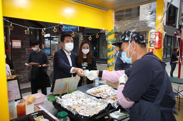 À̰´ö ½ÃÀåÀº Á÷¿øµé°ú ÇÔ²² Æ÷Ç×»ç¶û»óǰ±ÇÀ» »ç¿ëÇØ ½Ç°³Ãµ °Å¸®¿¡ ºñÄ¡µÈ ¾ß¿ÜÅ×ÀÌºí¿¡ ¾É¾Æ ¾ß½ÃÀå¿¡¼ ÆÇ¸ÅÇÏ´Â ´Ù¾çÇÑ ¸Ô°Å¸®¸¦ Áñ±â¸ç Äڷγª19 »çÅ·Π¾î·Á¿òÀ» °Þ´Â ¼Ò»ó°øÀΰú ÀüÅë½ÃÀå »ì¸®±â¿¡ ¾ÕÀå¼± Á÷¿øµéÀÇ ³ë·Â°ú ¼º°ú¸¦ °øÀ¯Çϰí ÀÀ¿ø°ú °Ý·ÁÀÇ ¸Þ½ÃÁö¸¦ Àü´ÞÇß´Ù.