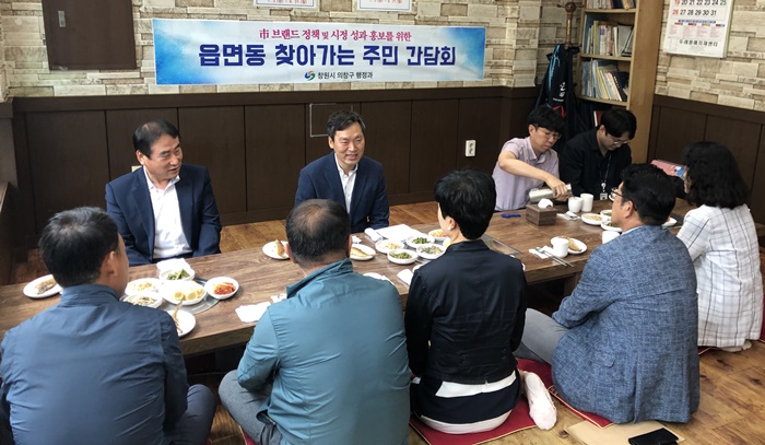 | È«¸íÇ¥ â¿ø½Ã ÀÇⱸûÀå(°¡¿îµ¥)ÀÌ 24ÀÏ º®»êºí·ç¹Ö¾ÆÆÄÆ® ÀÔÁÖÀÚ ´ëÇ¥µé°ú ¸¸³²À» °®°í °øµ¿ÁÖÅà ³» Çö¾È ¾÷¹«¸¦ °øÀ¯Çϰí ÀǰßÀ» ³ª´©´Â ½Ã°£À» °¡Á³´Ù. |