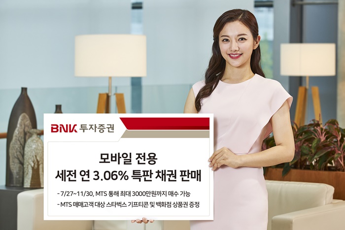 [½Ã»çÄÚ¸®¾ÆÀú³Î=ÀÌȯ¼ö ±âÀÚ] BNKÅõÀÚÁõ±Ç(´ëÇ¥ÀÌ»ç ±èº´¿µ)Àº ¼¼Àü ¿¬ 3.06%(7¿ù 27ÀÏ ±âÁØ)ÀÇ MTS(¸ð¹ÙÀÏÆ®·¹À̵ù½Ã½ºÅÛ) Àü¿ë ƯÆÇ ä±ÇÀÎ ‘ÇѼÖÁ¦Áö247 ä±Ç’À» 15¾ï Çѵµ·Î ÆÇ¸ÅÇÑ´Ù°í 27ÀÏ ¹àÇû´Ù.