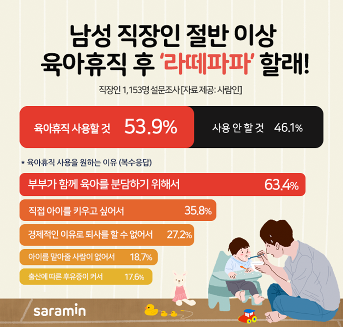 ±¸Àα¸Á÷ ¸ÅĪÇ÷§Æû »ç¶÷ÀÎ(www.saramin.co.kr ´ëÇ¥ ±è¿ëȯ)ÀÌ Á÷ÀåÀÎ 1,153¸íÀ» ´ë»óÀ¸·Î ‘À°¾ÆÈÞÁ÷’À» ÁÖÁ¦·Î Á¶»çÇÑ °á°ú, ³²¼º ÀÀ´äÀÚ Áß 53.9%°¡ ‘½ÇÁ¦ À°¾ÆÈÞÁ÷ »ç¿ë °èȹÀÌ ÀÖ´Ù’°í ´äÇß´Ù.