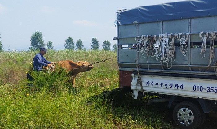 | °æ³² ÇÕõ¿¡¼ Áö³ Æø¿ì·Î ÈÛ¾µ¸° ¼Ò°¡ 90km ¶³¾îÁø â¿ø½Ã ÀÇⱸ ´ë»ê¸é¿¡¼ 10¿©Àϸ¸¿¡ ¹ß°ßµÈ ÈÄ ÁÖÀο¡°Ô ¹«»çÈ÷ ÀÎ°èµÆ´Ù. »çÁøÀº ¹ß°ßµÈ ¼Ò¸¦ Æ®·°¿¡ ½Æ°í ÀÖ´Â ¸ð½À. |