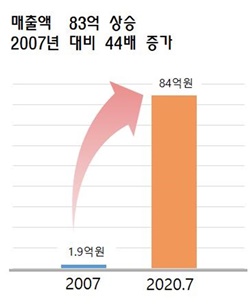 2007³â 4¿ù Á¤½Ä¿ÀÇÂ Ã¹ÇØ ¸ÅÃâ¾× 1¾ï9õ¸¸¿ø°ú ºñ±³ÇÒ ¶§ ¹«·Á 44¹è³ª Áõ°¡ÇÑ ¼öÄ¡ÀÌ´Ù.