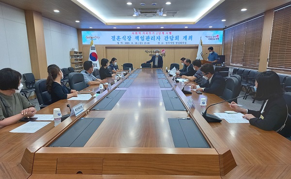 [½Ã»çÄÚ¸®¾ÆÀú³Î=À̵¿¿ì ±âÀÚ] °æÁֽô Áö³ 28ÀÏ ½Ãû ¿µ»óȸÀǽǿ¡¼ Áö¿ª ³» ¿¹½ÄÀå Ã¥ÀÓ°ü¸®ÀÚ ¹× ´ã´çÀÚ 10¿© ¸íÀÌ Âü¼®ÇÑ °¡¿îµ¥ °áÈ¥½ÄÀå »çȸÀû °Å¸®µÎ±â 2´Ü°è ¼¼ºÎÁöħ Áؼö¿Í °ü·ÃÇÑ °£´ãȸ¸¦ °³ÃÖÇß´Ù°í ¹àÇû´Ù.