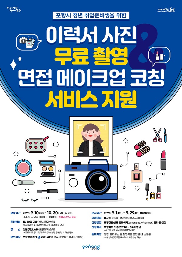 ½Åû ¹æ¹ýÀº Æ÷Ç×ûÃá¼¾ÅÍ È¨ÆäÀÌÁö(https://www.pohang.go.kr/youthph)¿¡ Á¢¼ÓÇÏ¿© ½ÅûÇÏ¸é µÇ¸ç, 9¿ù 1ÀϺÎÅÍ 9¿ù 29ÀϱîÁö ¼±Âø¼ø 150¸íÀ» ¸ðÁýÇÑ´Ù.