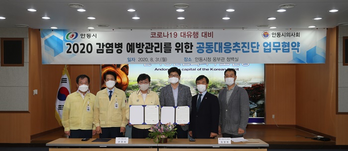 [½Ã»çÄÚ¸®¾ÆÀú³Î=±è¿¬ÇÐ ±âÀÚ] ¾Èµ¿½Ã(½ÃÀå ±Ç¿µ¼¼)¿Í ¾Èµ¿½ÃÀÇ»çȸ(ȸÀå ÃÖ¿µÈ¯)´Â 31ÀÏ ¾Èµ¿½Ãû ¿õºÎ°ü û¹é½Ç¿¡¼ Äڷγª19 µî ½ÅÁ¾ °¨¿°º´ À¯Çà¿¡ È¿°úÀûÀ¸·Î ´ëóÇϱâ À§ÇØ °øµ¿´ëÀÀÃßÁøÀ» À§ÇÑ Çù¾à½ÄÀ» °¡Á³´Ù.
