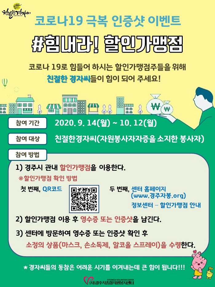 ÀÚ¿øºÀ»çÀÚÁõÀ» ¼ÒÁöÇÑ ÀÚ¿øºÀ»çÀÚ¶ó¸é ´©±¸³ª À̺¥Æ®¿¡ Âü¿©°¡ °¡´ÉÇϸç, °æÁֽà Áö¿ª ³» 147°³ ¾÷ü Áß ÇÑ °÷À» À̺¥Æ® ±â°£µ¿¾È ÀÌ¿ëÇÑ ÈÄ ÀÎÁõ»çÁø ¶Ç´Â ¿µ¼öÁõÀ» °æÁÖ½ÃÁ¾ÇÕÀÚ¿øºÀ»ç¼¾ÅÍ¿¡ Á¦ÃâÇÏ¸é ¸¶½ºÅ©, ¼Õ¼Òµ¶Á¦ µî °³Àι濪¹°Ç°À» ¹ÞÀ» ¼ö ÀÖ´Ù.