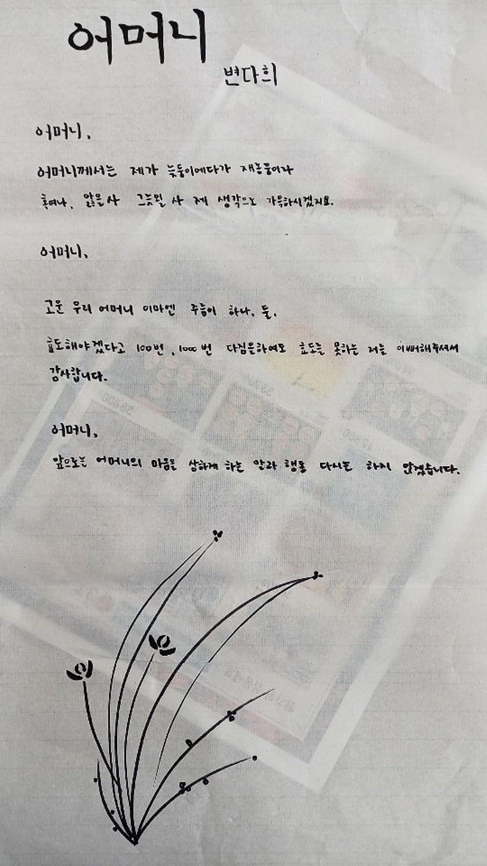 À̳¯ Àå¿øÀ¸·Î »ÌÈù 1Çг⠺¯´ÙÈñ ÇлýÀÇ ±ÛÀº ´ã´ãÇÏ°í ´ÙÁ¤ÇÑ ¾îÅõ·Î ¾î¸Ó´Ï²² ¹ÞÀº »ç¶û¿¡ ´ëÇÑ °¨»çÇÑ ¸¶À½À» ´ã¾Æ ´õ¿í ´«±æÀ» ²ö´Ù.