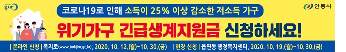[½Ã»çÄÚ¸®¾ÆÀú³Î=±è¿¬ÇÐ ±âÀÚ] ¾Èµ¿½Ã´Â ¿À´Â 10¿ù 12ÀϺÎÅÍ 30ÀϱîÁö ¿Â¶óÀÎ(º¹Áö·Î ȨÆäÀÌÁö) ¶Ç´Â À¾¸éµ¿ ÇàÁ¤º¹Áö¼¾Å͸¦ ÅëÇØ ±ä±Þ»ý°èÁö¿ø±Ý ½ÅûÀ» ¹Þ´Â´Ù°í ¹àÇû´Ù.