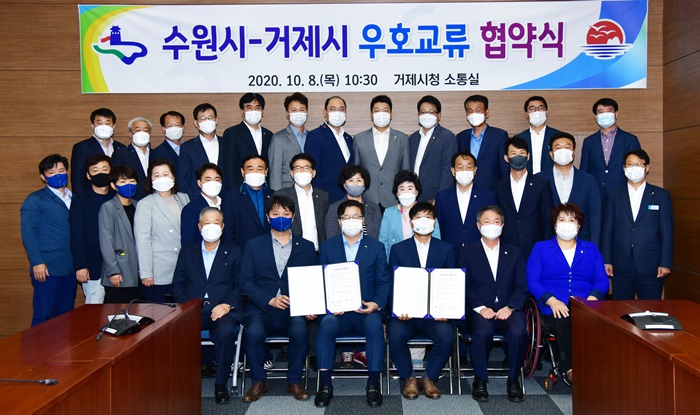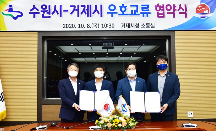 | °ÅÁ¦½Ã¿Í ¼ö¿ø½Ã°¡ 3ÀÏ ¿ìÈ£±³·ù Çù¾àÀ» ü°áÇß´Ù. »çÁøÀº º¯±¤¿ë °ÅÁ¦½ÃÀå°ú ¿°Å¿µ ¼ö¿ø½ÃÀå, ¿Á¿µ¹® °ÅÁ¦½ÃÀÇȸ ÀÇÀå°ú Á¶¼®È¯ ¼ö¿ø½ÃÀÇȸ ÀÇÀåÀÌ Çù¾à¼¸¦ µé¾îº¸À̰í ÀÖ´Ù, |