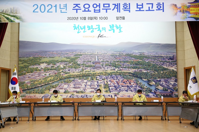 [½Ã»çÄÚ¸®¾ÆÀú³Î=À̵¿¿ì ±âÀÚ] °æÁֽô 8ÀÏ ±¹·¼Ò·º»ºÎÀå°ú »êÇϱâ°üÀå µîÀÌ Âü¼®ÇÑ °¡¿îµ¥ ÁÖ³«¿µ °æÁÖ½ÃÀå ÁÖÀç·Î ‘2021³âµµ ÁÖ¿ä¾÷¹«°èȹ º¸°íȸ’¸¦ °³ÃÖÇß´Ù.