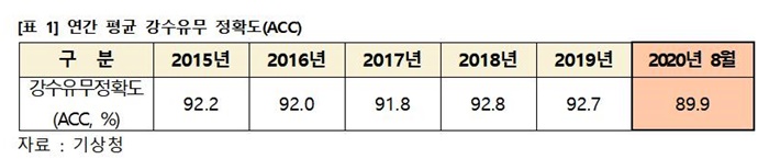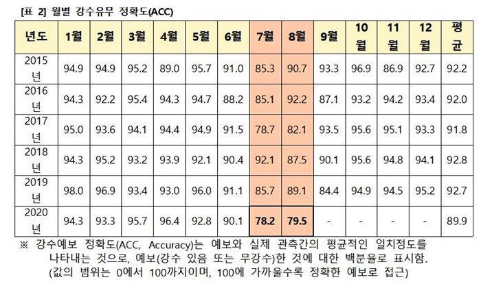 ¾ÈÈ£¿µ ÀÇ¿øÀÌ ±â»óû¿¡¼ Á¦Ãâ ¹ÞÀº ÃÖ±Ù 5³â°£ ±â»óû ¿¹º¸ ÀûÁß·ü ÇöȲ ÀڷḦ ºÐ¼®ÇÑ °á°ú, ¿¬°£ Æò±Õ °¼öÀ¯¹« Á¤È®µµ(ACC)´Â 2015³âºÎÅÍ 2019³â±îÁö´Â 92%´ë ÀÌ»ó Á¤È®µµ¸¦ À¯ÁöÇßÀ¸³ª 2020³â 8¿ù ±âÁØ Á¤È®µµ´Â 89.9%·Î ¾à 2%Æ÷ÀÎÆ® Á¤µµ ÀÌ»ó Â÷À̰¡ ¹ß»ýÇÏ´Â °ÍÀ» È®ÀÎÇß´Ù.