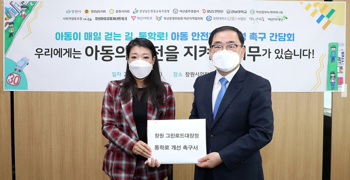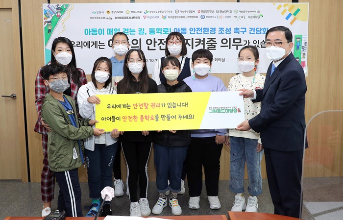 13ÀÏ Ã¢¿ø½ÃÀÇȸ ȸÀǽǿ¡¼ ÃÊ·Ï¿ì»ê¾î¸°ÀÌÀç´Ü°ú ÇÔ²²ÇÑ ‘¾Æµ¿ ¾ÈÀüȯ°æ Á¶¼º Ã˱¸ °£´ãȸ'¿¡¼ â¿ø ±×¸°·Îµå´ëÀåÁ¤¿¡ Á÷Á¢ Âü¿©ÇÑ ÃʵîÇб³ 6Çгâ ÇлýµéÀÌ Ç㼺¹« ½ÃÀå¿¡°Ô ¾ÈÀüÇϰí ÄèÀûÇÑ ÅëÇзΠÁ¶¼ºÀ» À§ÇÑ ÀǰßÀ» ¸»Çϸç, ÅëÇзΠ°³¼± Ã˱¸¼¸¦ Àü´ÞÇß´Ù.