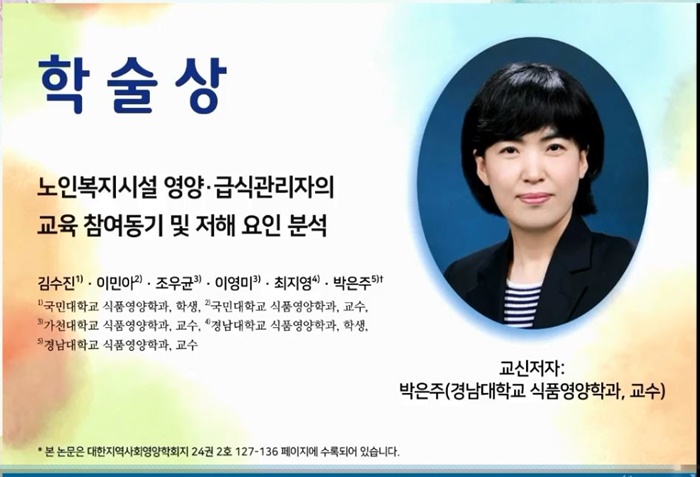 [½Ã»çÄÚ¸®¾ÆÀú³Î=ÀÌȯ¼ö ±âÀÚ] °æ³²´ëÇб³ ½Äǰ¿µ¾çÇаú ¹ÚÀºÁÖ ±³¼ö ¿¬±¸ÆÀÀÌ Áö³ 16ÀÏ ´ëÇÑÁö¿ª»çȸ¿µ¾çÇÐȸ Ãß°èÇмú´ëȸ¿¡¼ '³ëÀκ¹Áö½Ã¼³ ¿µ¾ç·±Þ½Ä°ü¸®ÀÚÀÇ ±³À° Âü¿©µ¿±â ¹× ÀúÇØ ¿äÀÎ ºÐ¼®' ³í¹®À¸·Î Çмú»óÀ» ¼ö»óÇß´Ù.