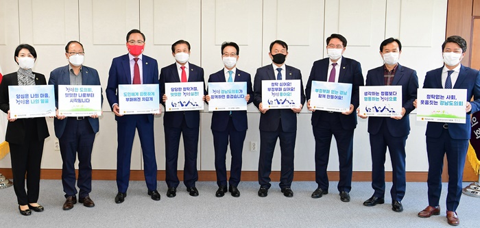 [½Ã»çÄÚ¸®¾ÆÀú³Î=Á¤Á¾¹Î ¼±ÀÓ±âÀÚ] °æ³²µµÀÇȸ ±èÇÏ¿ë ÀÇÀåÀ» ºñ·ÔÇÑ ÀÇÀå´ÜÀº 20ÀÏ Á¦380ȸ ÀÓ½Ãȸ¿¡ ¾Õ¼ °£´ãȸ ÀÚ¸®¿¡¼ û·Å½Çõ ´ÙÁüÀ» À§ÇÑ Ã»·Å½Çõ 縰Áö Ä·ÆäÀÎÀ» ½Ç½ÃÇß´Ù.