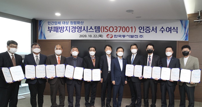µ¿¼¹ßÀüÀº 22ÀÏ º»»ç(¿ï»ê Áß±¸ ¼ÒÀç)¿¡¼ ÇÑÀü»ê¾÷°³¹ßÀ» Æ÷ÇÔÇÑ 10°³ ¹Î°£ Çù·Âȸ»ç°¡ Âü¼®ÇÑ °¡¿îµ¥ ºÎÆÐ¹æÁö°æ¿µ½Ã½ºÅÛ(ISO 37001) ÀÎÁõ¼ ¼ö¿©½ÄÀ» °³ÃÖÇß´Ù.