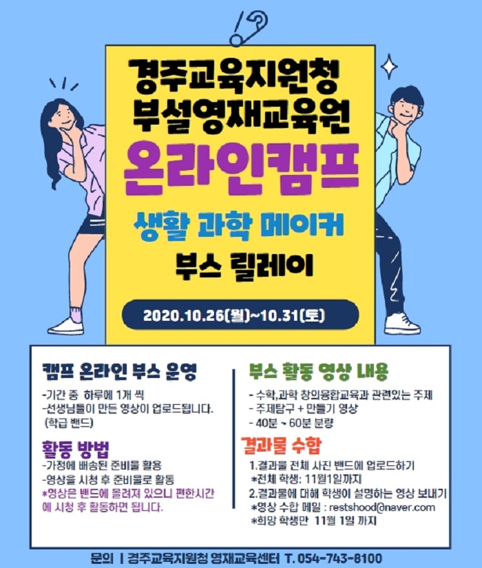 [½Ã»çÄÚ¸®¾ÆÀú³Î=À̵¿¿ì ±âÀÚ] °æÁÖ±³À°Áö¿øÃ» ºÎ¼³ ¿µÀç±³À°¿ø(¿øÀå ÀÌÀÎȯ)Àº 26ÀÏ~31ÀϱîÁö 6Àϰ£ ÃÊ·Áßµî ¿µÀç 140¿©¸íÀ» ´ë»óÀ¸·Î ‘»ýȰ °úÇÐ ¸ÞÀÌÄ¿ ºÎ½º ¸±·¹ÀÌ’¶ó´Â ÁÖÁ¦·Î ¿Â¶óÀÎ ¿µÀç Ä·ÇÁ¸¦ ¿î¿µÇÑ´Ù°í ÀüÇß´Ù.