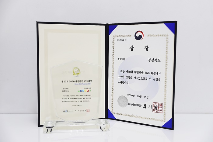 [½Ã»çÄÚ¸®¾ÆÀú³Î=±è¿¬ÇÐ ±âÀÚ] °æºÏµµ°¡ ¿î¿µÇÏ´Â °ø½Ä SNS ä³ÎÀÌ ‘Á¦10ȸ 2020 ´ëÇѹα¹ SNS ´ë»ó’¿¡¼ ÃÖ°í»óÀÎ °ø°øºÎ¹® Á¾ÇÕ´ë»ó(°úÇбâ¼úÁ¤º¸Åë½ÅºÎ Àå°ü»ó)À» ¼ö»óÇß´Ù.