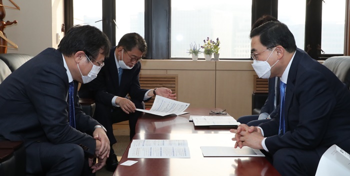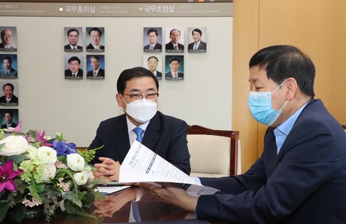 | Ç㼺¹« â¿ø½ÃÀå(¿ÞÂÊ)ÀÌ ±¸À±Ã¶ ±¹¹«Á¶Á¤½ÇÀå(¿À¸¥ÂÊ)À» ¸¸³ª â¿ø½Ã¿¡ ´ëÇÑ Àû±ØÀûÀÎ Á¤ºÎ Áö¿øÀ» ¿äûÇϰí ÀÖ´Ù. |