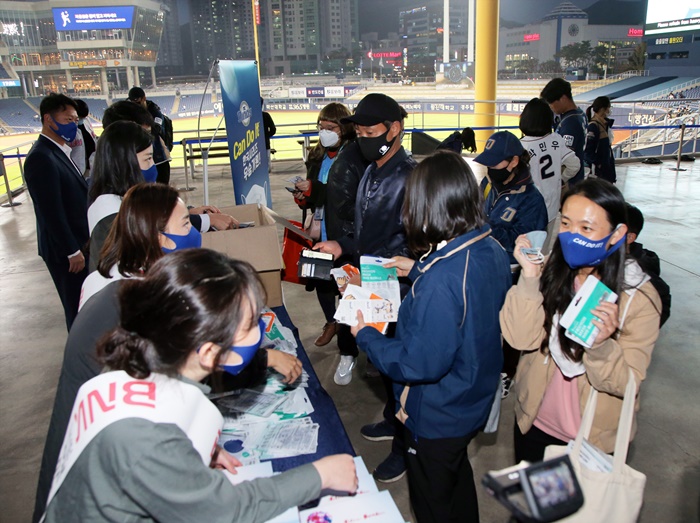 »çȸ°øÇåÈ«º¸ºÎ Á÷¿ø 10¸íÀº NC ´ÙÀ̳뽺ÀÇ ¿ÃÇØ ¸¶Áö¸· Ȩ°æ±âÀÎ »ï¼º¶óÀÌ¿ÂÁî °æ±â Àü 2¹ø °ÔÀÌÆ® ºÎ±Ù¿¡ ºÎ½º¸¦ ¸¶·ÃÇÏ°í Æ¯º° Á¦ÀÛÇÑ ÆÐ¼Ç¸¶½ºÅ© 1,100ÀåÀ» °üÁߵ鿡°Ô ³ª´²Áá´Ù.