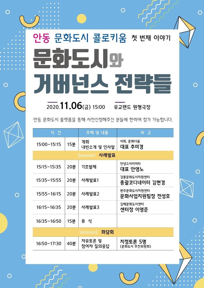 1ȸ Â÷ ÄÝ·ÎŰ¿òÀº '¹®Èµµ½Ã¿Í °Å¹ö³Í½º Àü·«µé'À» ÁÖÁ¦·Î ¾È¿µ³ë(¾È³ç¼Ò»çÀÌ¾îÆ¼ ´ëÇ¥)ÀÇ ±âÁ¶¹ßÁ¦¿Í ÇÔ²² °¸ª°ú ¿ÏÁÖ, ±èÇØ µî Ÿ µµ½ÃÀÇ °Å¹ö³Í½º ±¸Ãà»ç·Ê¸¦ °øÀ¯Çϸç Âü¿©ÀÚ °£ ÀÚÀ¯Åä·Ð°ú ÁúÀÇÀÀ´äÀ¸·Î ÁøÇàµÇ¸ç, 11¿ù 6ÀÏ(±Ý) ¿ÀÈÄ 3½ÃºÎÅÍ À¯±³·£µå ¿øÇü¹«´ë¿¡¼ ÁøÇàµÉ ¿¹Á¤ÀÌ´Ù.